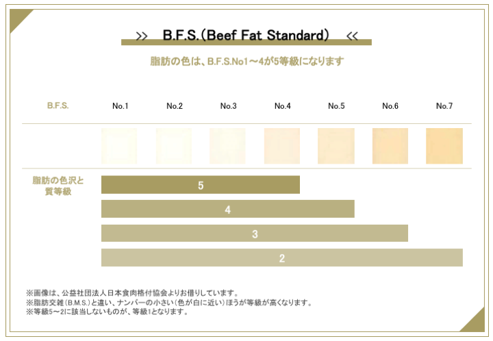 B.F.Sとは、Beef Fat Standard(ビーフ・ファット・スタンダード)の略で、表のように7段階にランク分けされます。