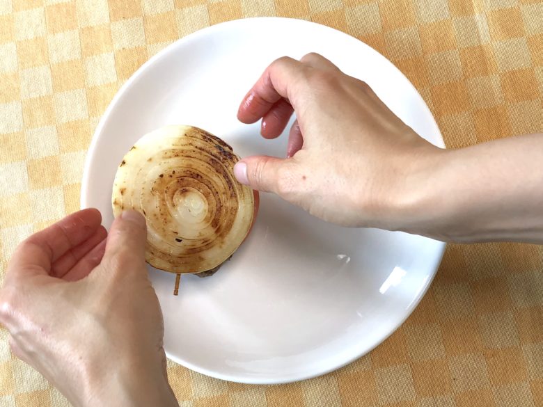 玉ねぎを乗せた時につまようじは抜いておきましょう。抜いておかないと、食べにくくなります。